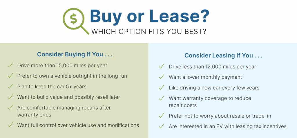 • Electric vehicle (EV) incentives may favor leasing. Certain federal tax credits are currently easier to access through a lease than a purchase, as dealers can apply the credit to reduce lease costs directly.